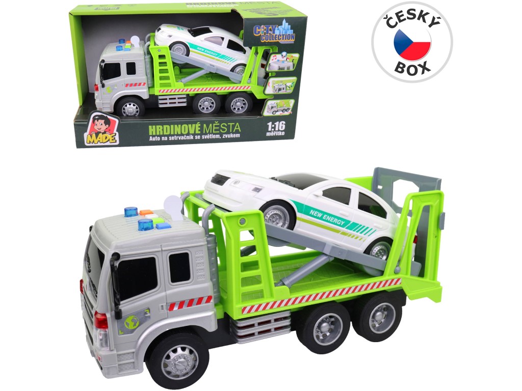 Auto odtahovka s autem, na setrvačník, se světlem a zvukem. Pro kluky, které baví hrát si s autíčky je tu další skvělý kousek z české kolekce City Collection. Jedná se o MaDe Auto odtahovka s autem, na setrvačník, se světlem a zvukem v měřítku 1:16. Vozidlo o délce 26 cm je vyrobeno z plastu. Výrobek je určen pro děti od tří let. Rozměr hračky je 28,5 x 10 x 15,5 cm. Rozměr balení je 32 x 18,5 x 11,5 cm. Materiál hračky je plast. Balení hračky je open box. Produkt je určený pro kluky. Ke zprovoznění produktu jsou potřeba 3 AG13 baterie. Baterie jsou součástí balení.
