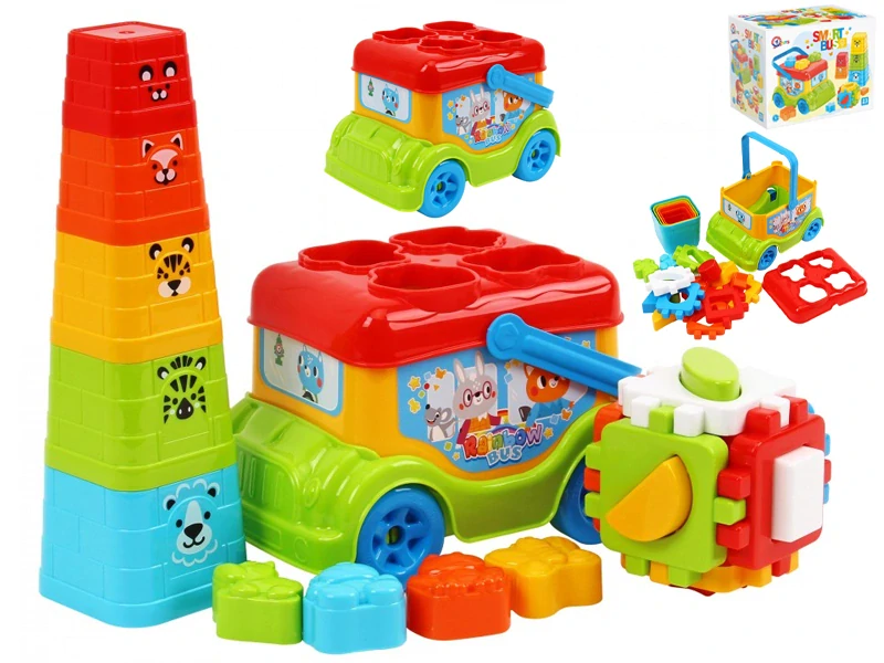 Autobus/vkládačka 20cm volný chod + pyramida skládací kalíšky 5ks a kostka vkládací 12m+ v krabičce