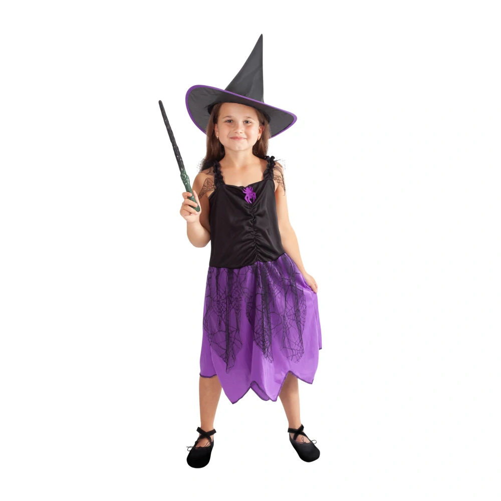 Roztomilý karnevalový kostým černo-fialové barvy udělá radost každé holčičce! Souprava obsahuje šaty dekorované pavučinkou a perfektně sladěný klobouk. Set ve velikosti S je určen pro holčičky ve věkovém rozmezí 3-6 let. Vhodný i na oslavu Halloweenu! Nejen letos je potřeba myslet EKO-nomicky i EKO-logicky! EKO-balení je vhodné zejména pro e-shopy kde zákazník nakupuje dle fotografie a není třeba velkého balení s věšákem. EKO-logicky – na balení bylo použito méně plastu a dalších materiálů. Jedná se o malý transparentní obal s fotografií. EKO-nomicky –EKO-obal zabere jen polovinu místa – šetřete skladová místa s námi!