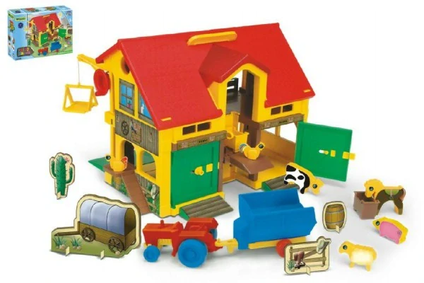Malý farmář může chovat slepičky, koníka, ovečku, prasátko a kravičku. Pomocí výtahu dokáže uklízet i balíky sena. Na farmě nesmí chybět traktor s valníkem, který obstará polní práci. Velikost: 40 x 35 cm, v krabici 59 x 40 x 15 cm. Vhodná od 3 let.