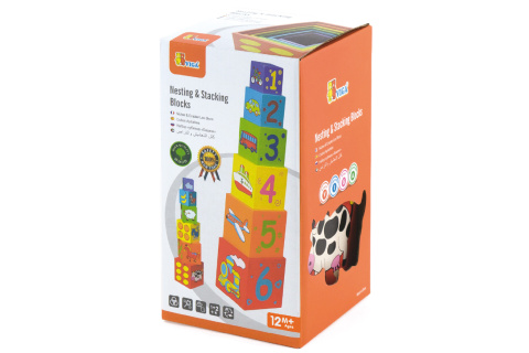 Dřevěná vkládačka 6 ks se zvířátky,čísly,ovocem a dopravními prostředky z každé strany kostky.Lze stavět jako pyramida na sebe.Rozměr největší kostky cca 11x 11cm.Věk 12m+