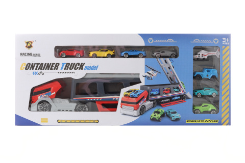 Sada obsahuje kamion, 7 autíček a 1 helikoptéru. Materiál plast. Kabina i dveře od přívěsu jsou otevírací. Baleno v krabici. Rozměry balení cca 58x24,5x9 cm. Věk 3+
