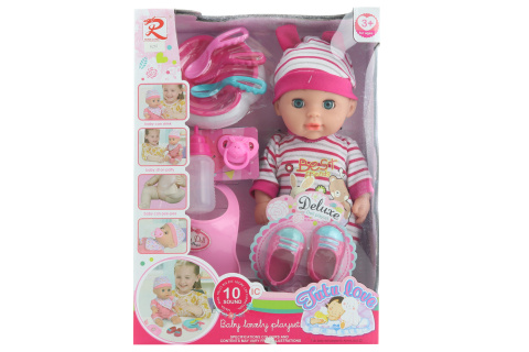Miminko s doplňky. Miminko po vložení baterií vydává zvuky a čůrá. Balení obsahuje také botičky pro panenku, plastový bryndáček, lahvičku, talířek a další doplňky. Napájení na 3 AG13 baterie (jsou součástí balení). Rozměry miminka cca 29 x 11 cm. Rozměry balení cca 24 x 33 x 11 cm. Věk 3+