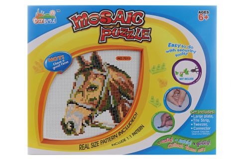 Mozaika s motivem koně. Balení obsahuje základnu pro stavění obrázku, pinzetu a 2 háčky pro zavěšení hotového obrázku. Materiál plast. Rozměry základny 26,6x19,9 cm. Rozměry balení 30x23,5x4 cm. Věk 3+ (doporučeno od 6 let)