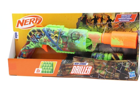 Blaster Nerf Zombie Driller je kompletně zdoben barevnými, poutavými graffiti inspirovanými zombie motivy na obou stranách. Design blasteru vytváří vzhled bojové výstroje, kterou by si zombie bojovníci vytvořili ve světě zaplaveném strašidelnými nemrtvými. Blaster Zombie Driller je navržen tak, aby vypadal jako vrtačka, která byla přeměněna na blaster pro boj se zombie. Má otočný válec s kapacitou 5 šipek a obsahuje 16 pěnových šipek Nerf Elite a odnímatelný puškohled Nerf. Blaster Nerf Zombie Driller se může pochlubit zábavnými detaily od začátku do konce, je skvělý pro fanoušky zombie a perfektním doplňkem pro zombie párty, hry a akce. Hračky Nerf jsou skvělé hračky do interiéru i exteriéru pro děti od 8 let, které si užijí zábavné a aktivní hraní. Každý kus se prodává samostatně, v závislosti na dostupnosti. Doporučují se brýle (nejsou součástí balení). Baterie nejsou potřeba.