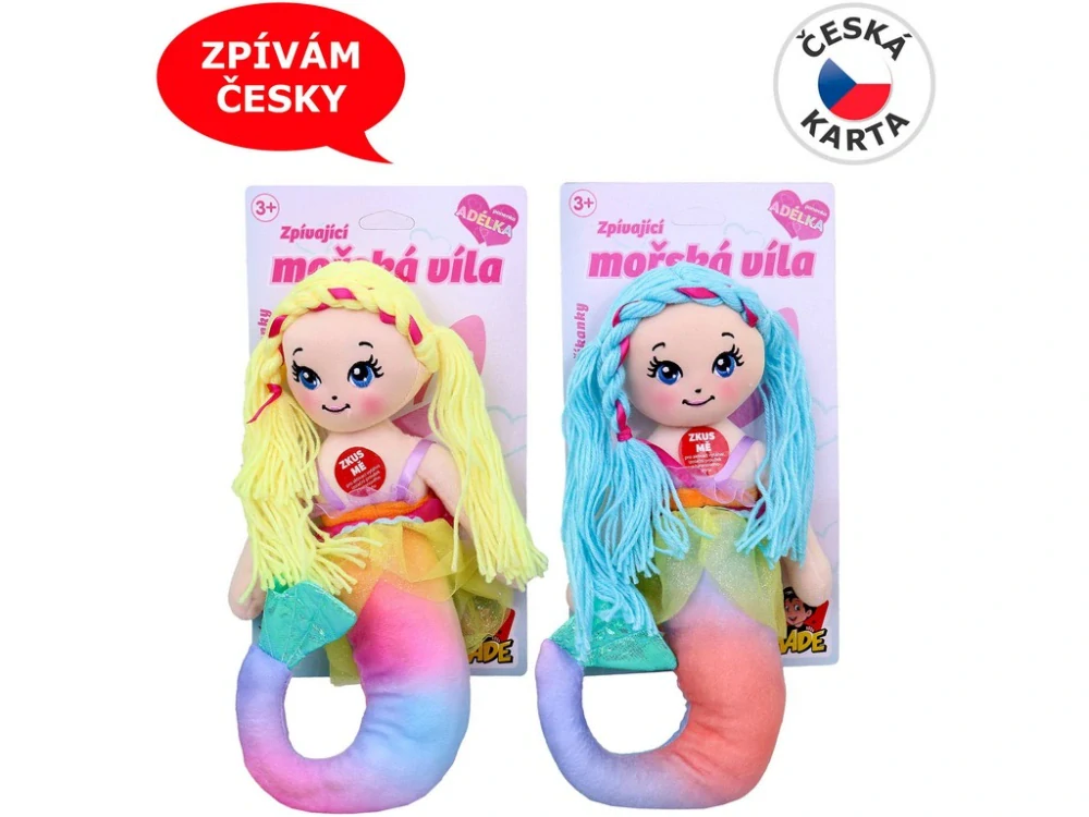 Panenka textilní - mořská panna, 38 cm. Panenka umí říkat dvě říkanky a zazpívá jednu krásnou písničku s tématikou vodního světa - Teče voda teče . Panenka je v pěkných pestrých barvách její materiál je textil a díky tomu je velmi příjemná na dotek a jako bonus celého vzhledu má třpytivou ploutev. Materiál: textilie. Rozměr: 38 cm. Produkt je určený pro holky.