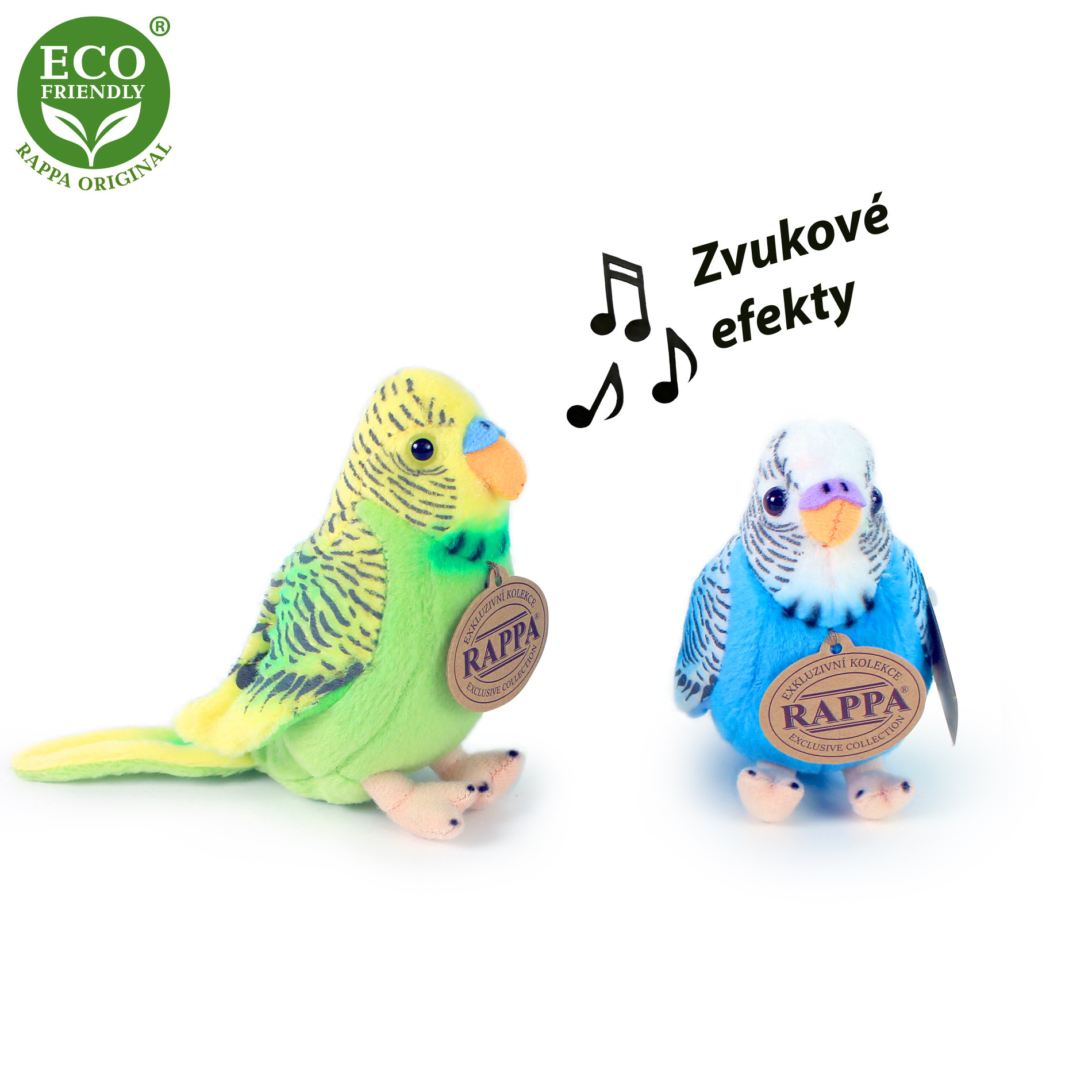 Krásná plyšová andulka se zvukem o velikosti 11 cm ve dvou druzích. Po stisknutí jejího bříška začne vydávat reálné cvrlikání. Andulka je vyrobena z vysoce kvalitní plyše a je tak součástí exkluzivní kolekce plyšových hraček . Co to vlastně ECO-FRIENDLY znamená? Výplň plyšové hračky je vyrobena z recyklovaných PET lahví. Tento materiál je zcela bezpečný, na omak nerozeznatelný od standartní výplně a plně atestovaný pro bezpečnost i těch nejmenších. Rozhodli jsme se jít zelenou cestou co nejméně zatěžující životní prostředí- cestou ECO-FRIENDLY.