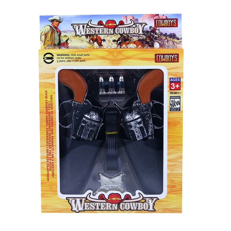 Stylová kovbojská sada! Tento parádní set obsahuje 2 pistole v kovbojských pouzdrech, odznak a opasek. Senzace!