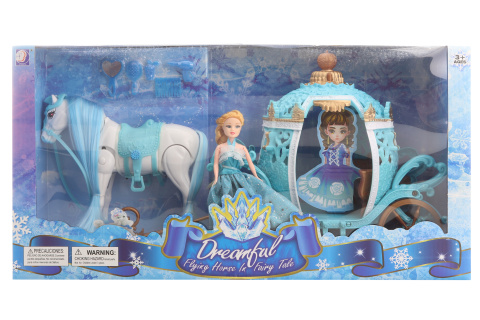 Koník s modrým kočárem a panenkou. Po vložení baterií koník chodí a hraje. Napájení na 2 AA baterie (nejsou součástí balení). Součástí balení je také panenka o velikosti cca 15 cm. Rozměry balení cca 48 x 25 x 17 cm. Věk 3+