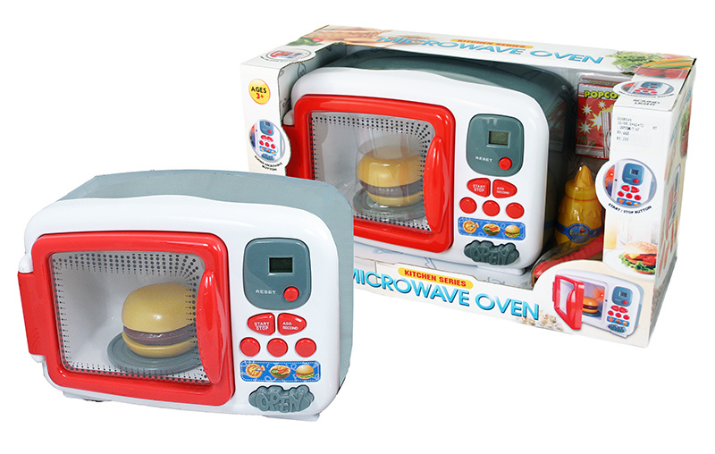 Dětská mikrovlnná trouba se zvuky a světlem, součástí jsou napodobeniny potravin.