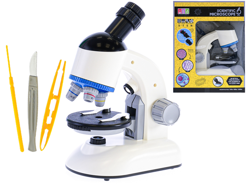 Mikroskop 22cm 100x,400x,1200x se světlem a doplňky v krabičceSkladem550 Kč/ ks455 Kč bez DPH